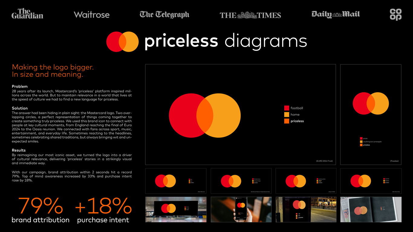 We wanted to illustrate Mastercard’s long-running ‘priceless’ platform in a bold, disruptive way. How? By transforming the brand’s iconic logo into a Venn diagram. Using this new visual language, the two familiar orbs represent distinct objects or experiences, and in the intersection, they come together to create something priceless. The eye-catching art direction was perfect for print formats, and the short, playful headlines delivered a ‘priceless’ message before people could turn the page. Every headline was contextual and culturally relevant – like reacting to sports news, celebrating the festive period or capturing the TV event of the year.