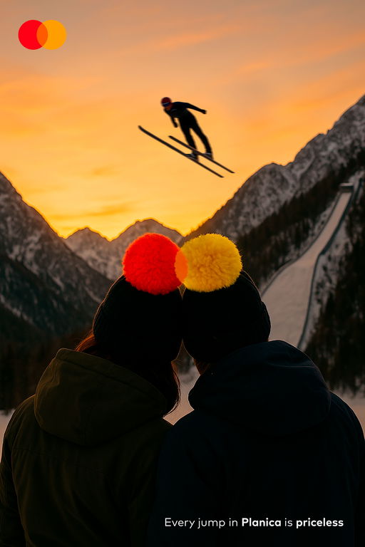 The Ski Jumping World Cup in Planica is not only about distance, speed or records. It is about those moments when people hold their breath together, when a single jump unites thousands of voices, when you feel that you truly belong. These moments cannot be bought - they are priceless. The poster captures this philosophy through a simple human image. Two people in black winter hats stand side by side. On top of one hat is a red pom-pom, on the other a yellow one. As they touch, the pom-poms overlap and naturally form the Mastercard symbol. In that small gesture of closeness, the message of belonging becomes visible and authentic. In the background a ski jumper soars high above the hill of Planica, framed by glowing mountains and a warm sunset. The athlete appears to be flying right between the two circles, suspended not only in air but in meaning. Sport here is not just performance – it is connection, trust and shared energy that binds people together. The slogan “Every jump in Planica is priceless” connects the visual with the idea. Each jump, whether on the ski hill or in life, carries more than meters: it carries love, friendship, courage and community. Combined with the message “Jump into a world where everyone belongs”, the poster extends this meaning universally – to all generations, cultures and identities. It tells young audiences that Planica is more than a competition - it is a place where people come together, where diversity is celebrated, where every jump is both personal and collective. A Priceless moment of belonging, open to all, and a reminder that the most valuable things in life cannot be measured, only shared.
